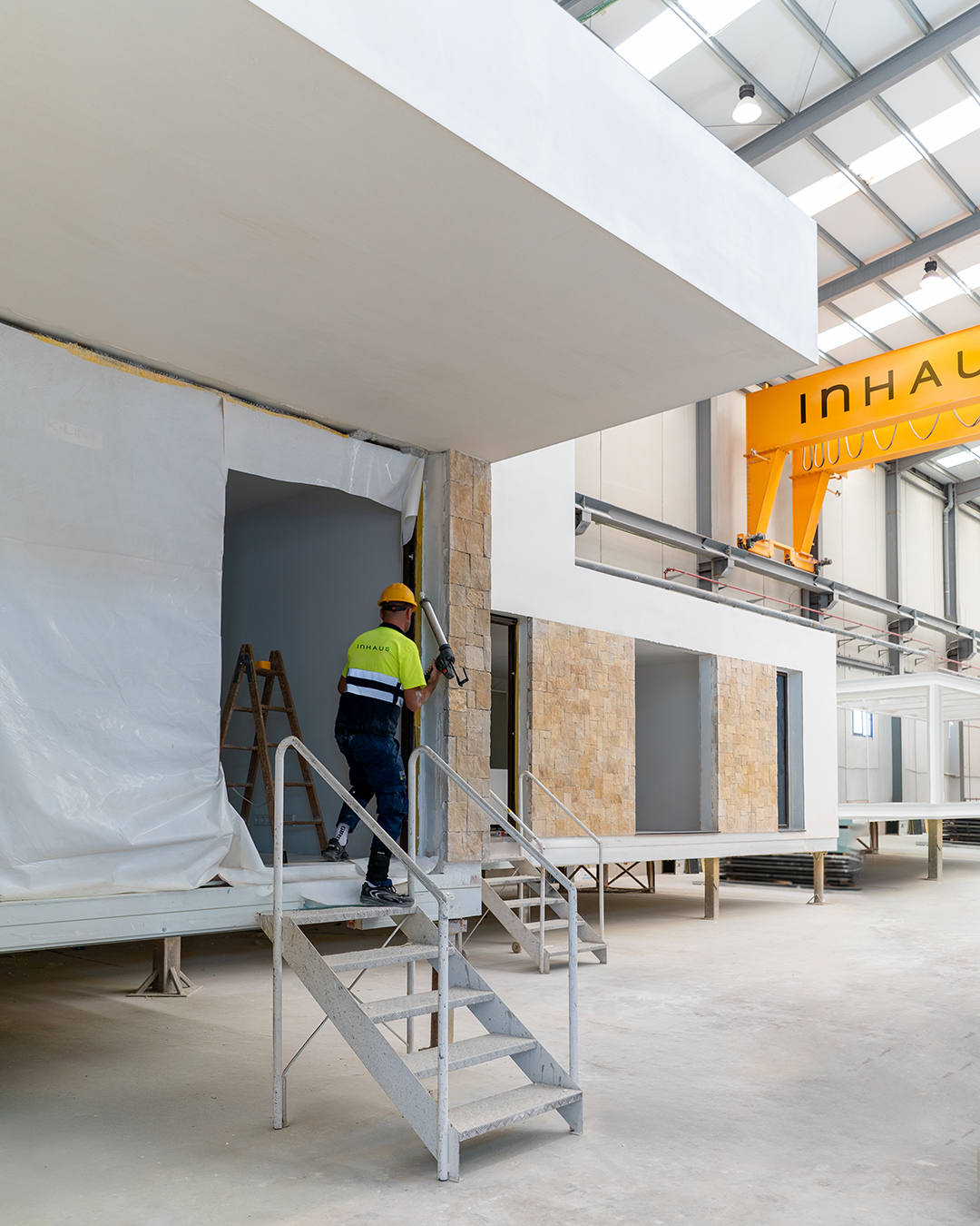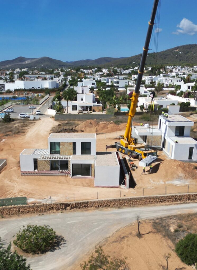 Each home consists of four modules, 95% factory-finished, including the natural stone façade, and transported by lorry and boat from our factory in Spain (Valencia) to Ibiza.
