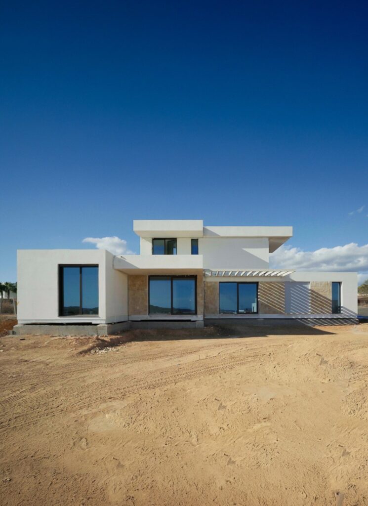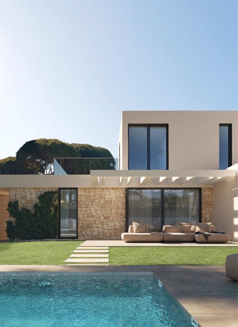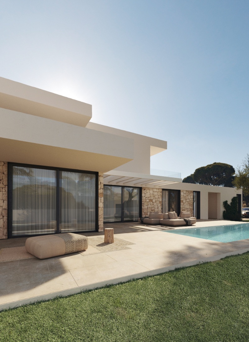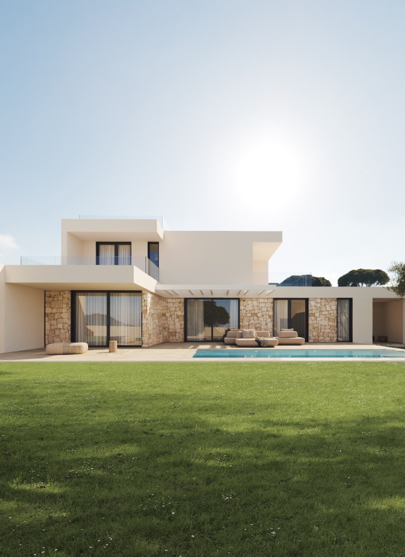 The designs of the three houses were based on the Bogenhausen model from our 111 modular house catalogue, with minor changes to the layout and aesthetics, but always maintaining similar materials and finishes. A style that references pure Mediterranean architecture, with the use of natural stone on all façades and white single-layer paint.