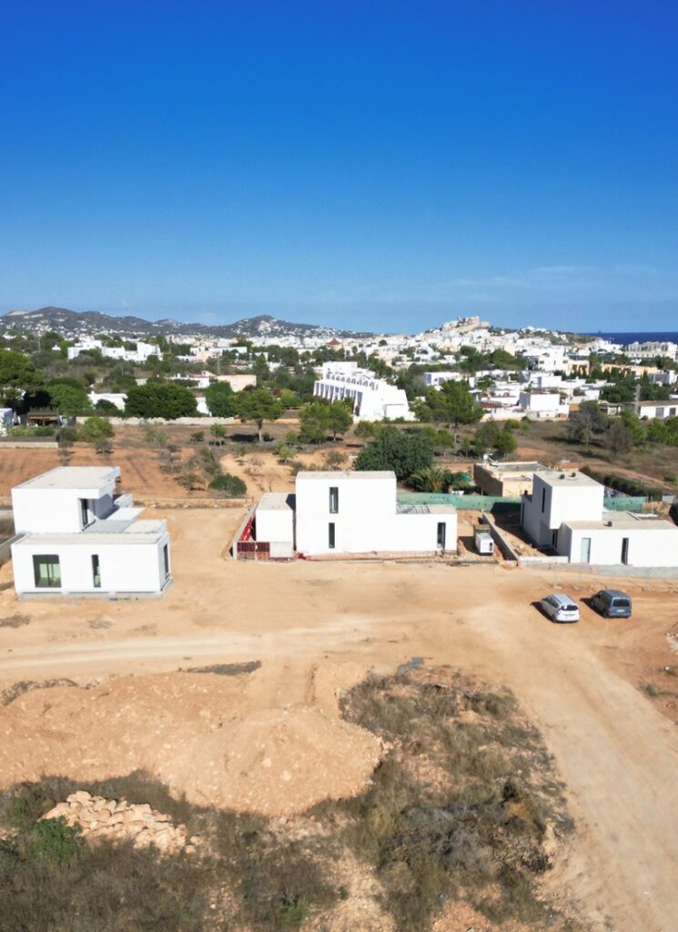 New development of three modular homes underway in Ibiza. A set of three industrialised single-family homes located on the same plot in Ibiza, each with its own outdoor space and swimming pool. A project totalling 583 m² of floor space between the three houses.