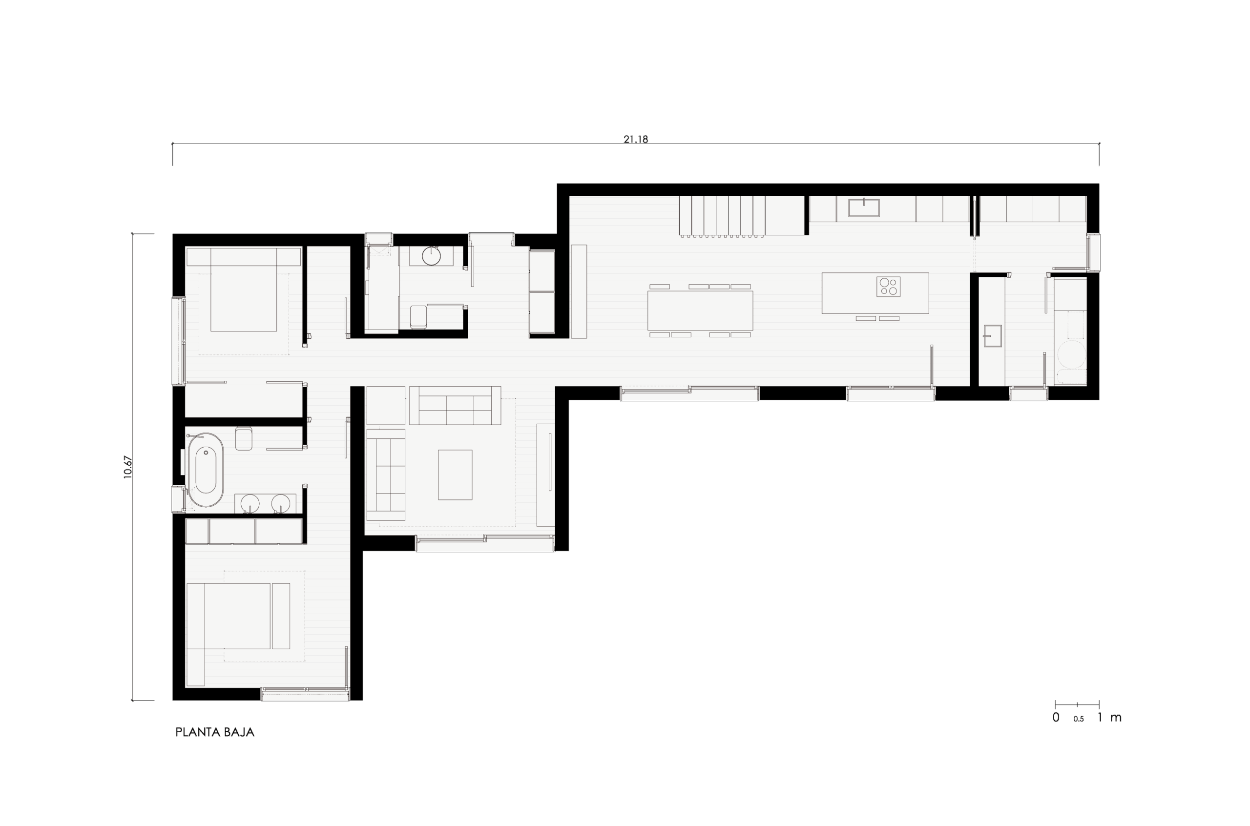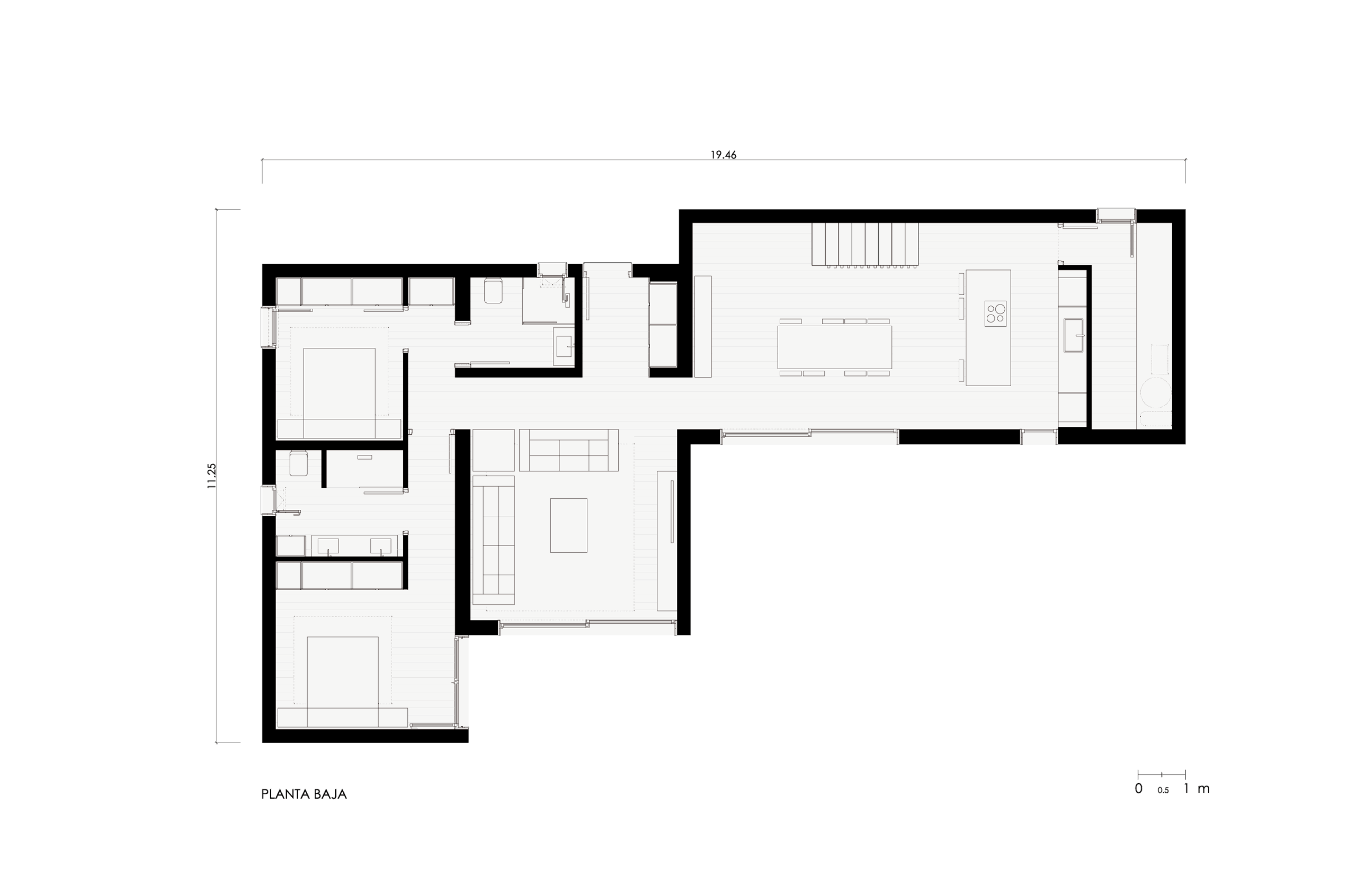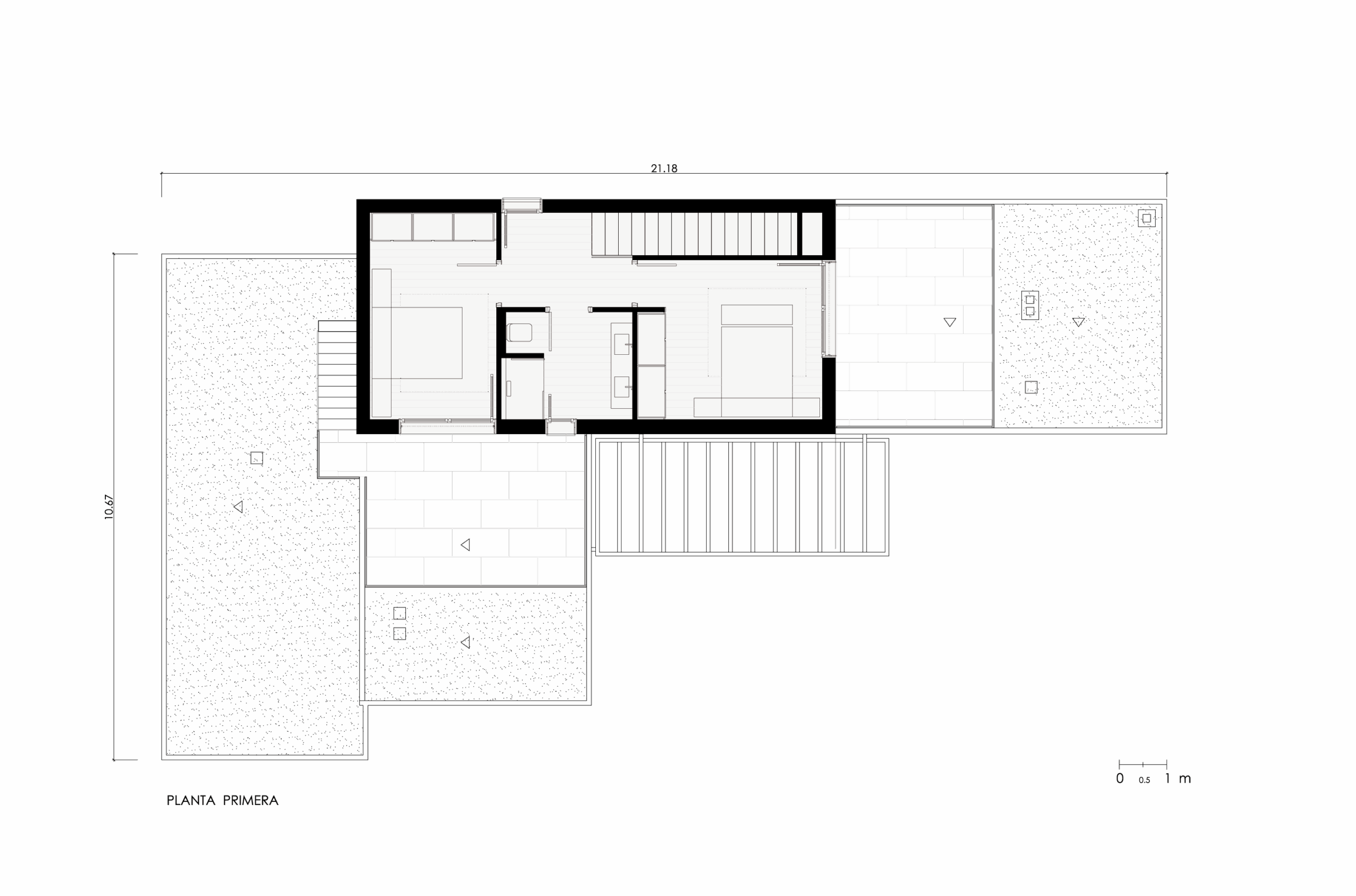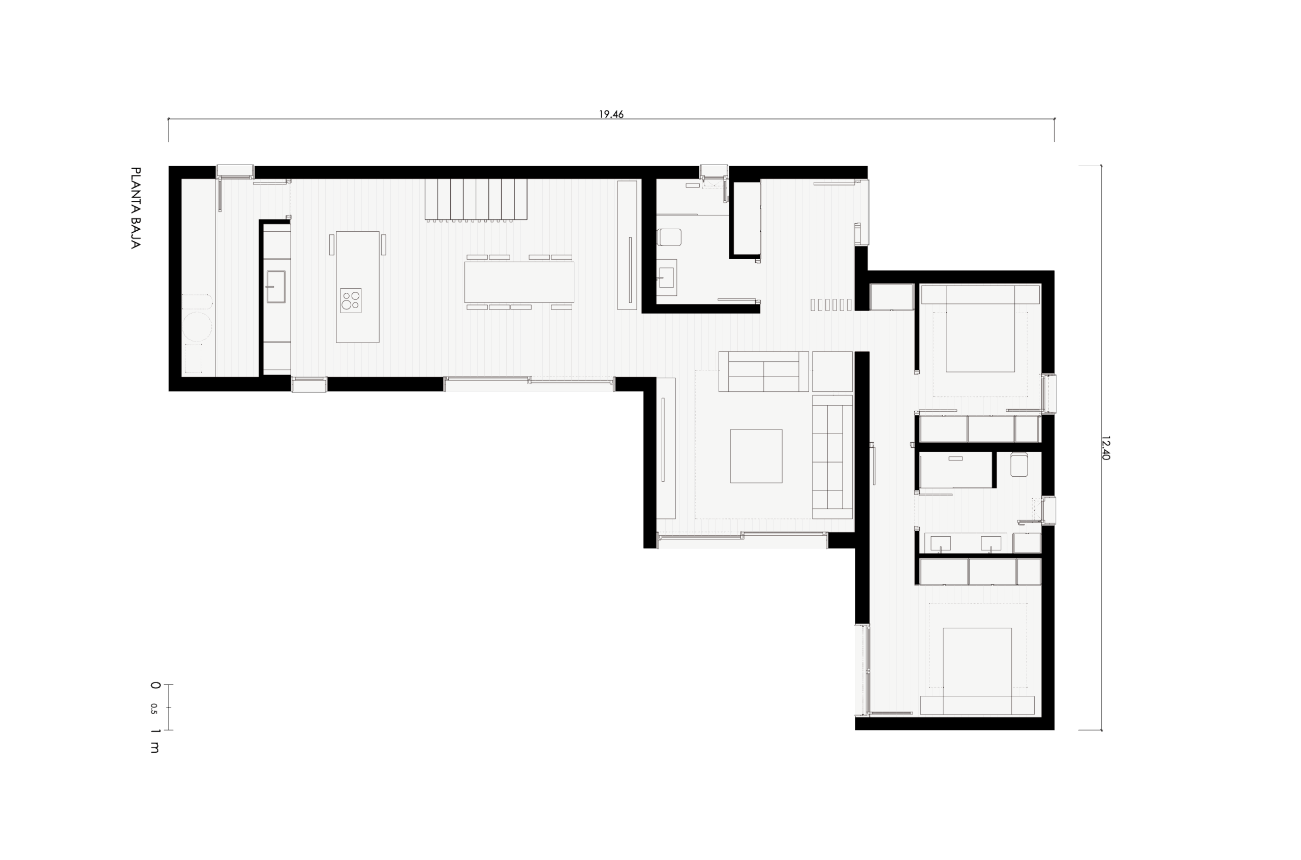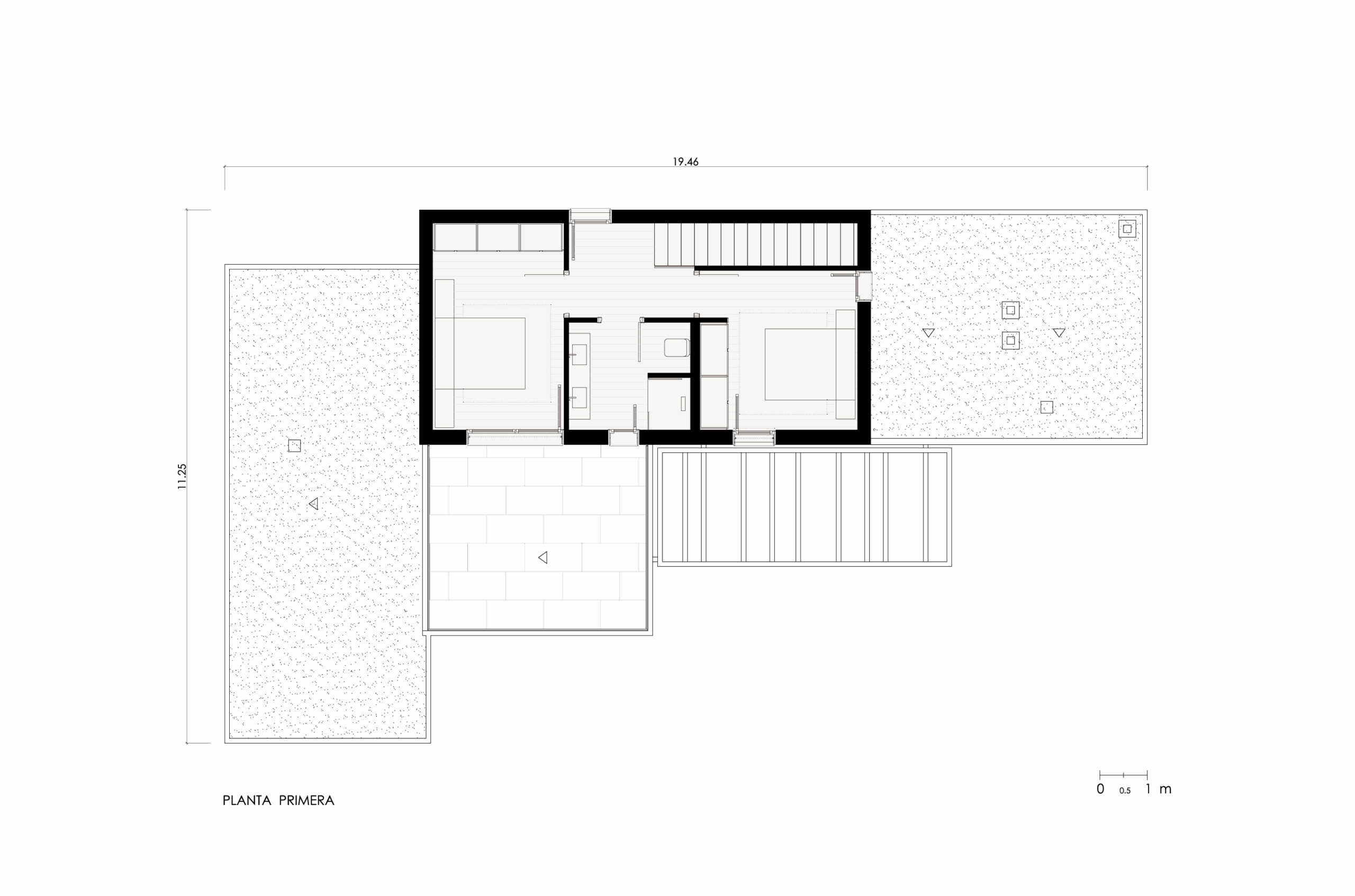 This house is located in the centre of the plot and has an L-shaped floor plan with a more compact aesthetic. It consists of four modules and a pergola that defines the outdoor area. The interior layout organises the living area in one wing of the ground floor, while the sleeping area is divided between the other wing of the ground floor and the upper floor. It has three bedrooms, three bathrooms and an office, making it the only one of the three houses to have a separate work area.