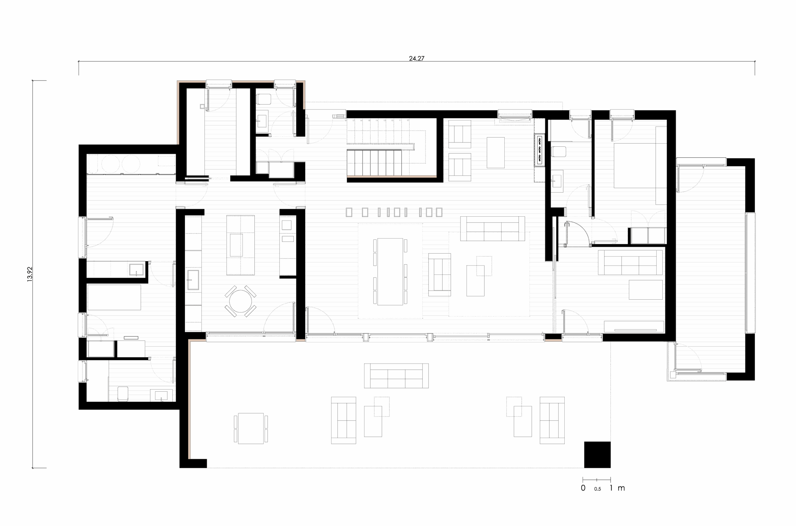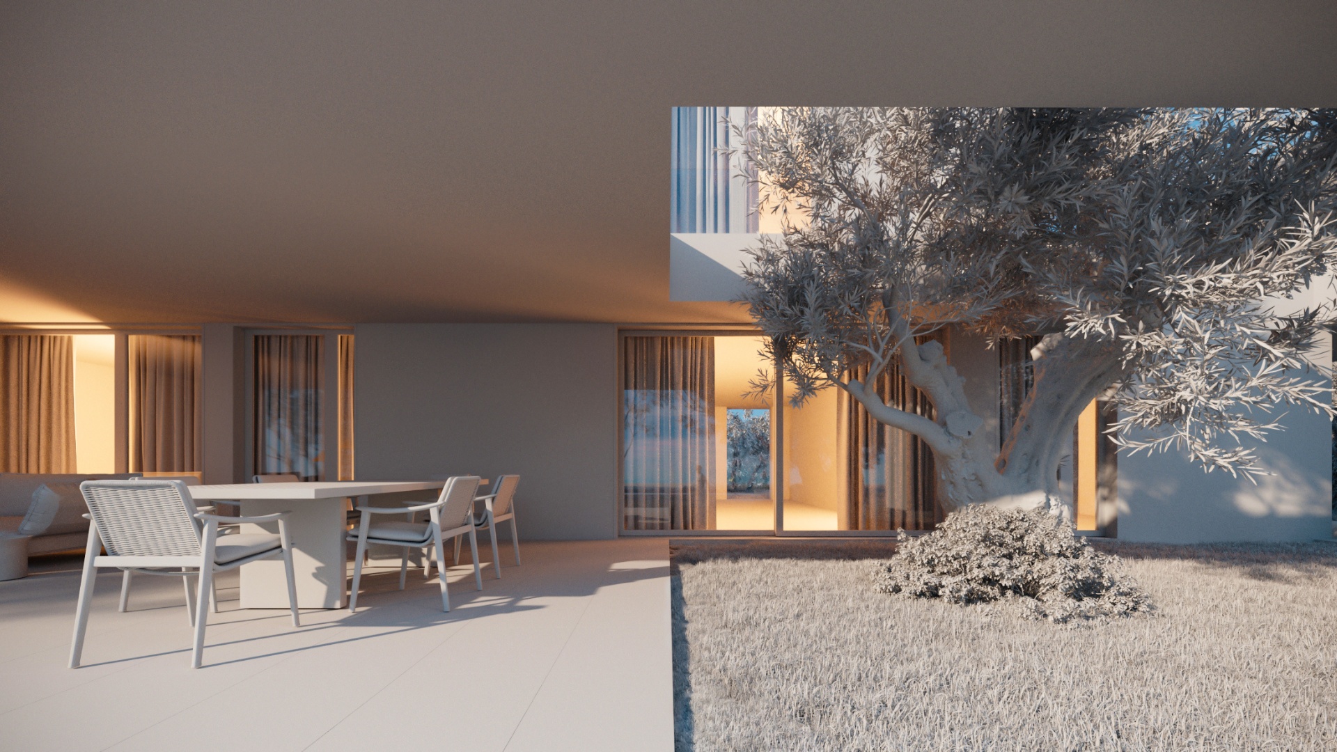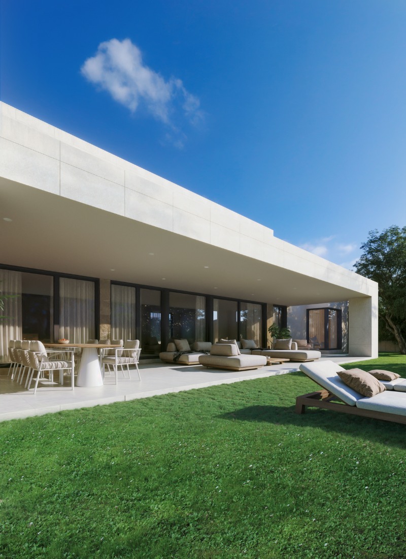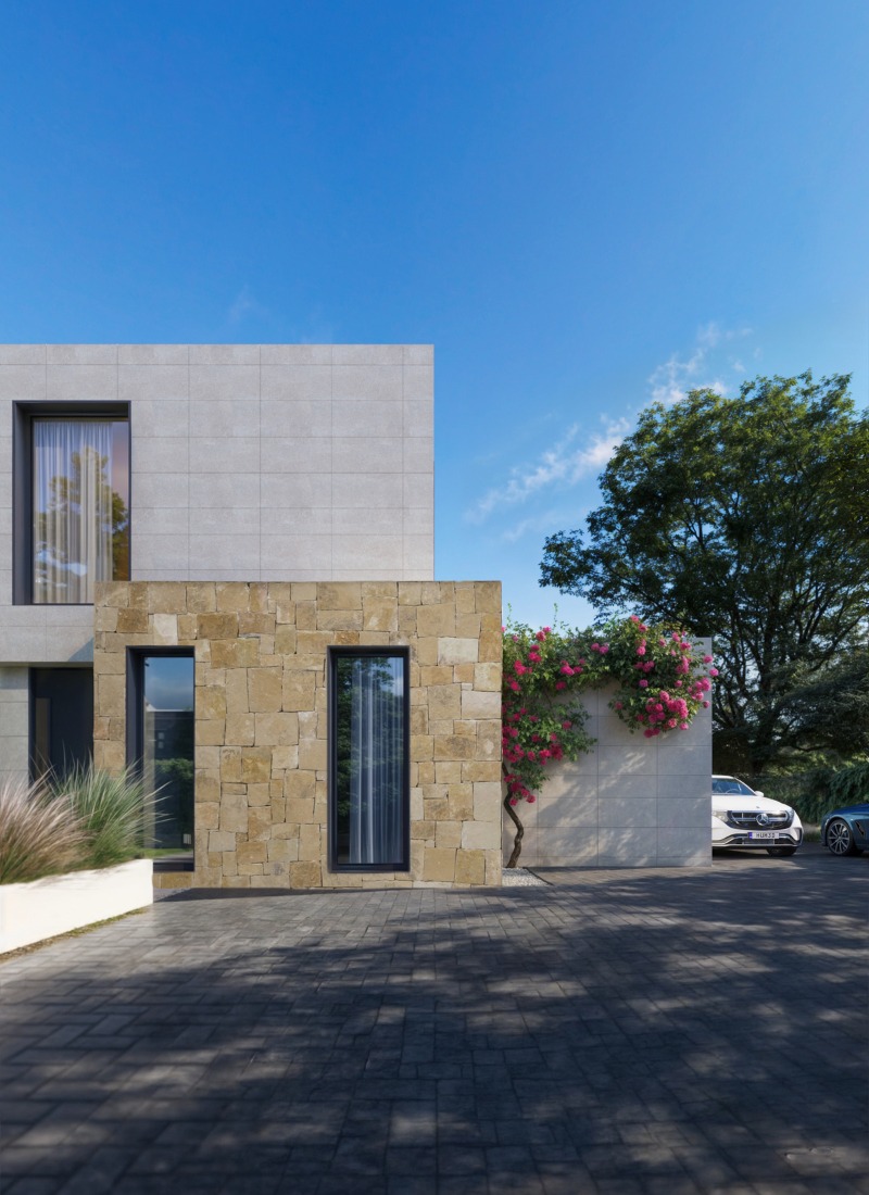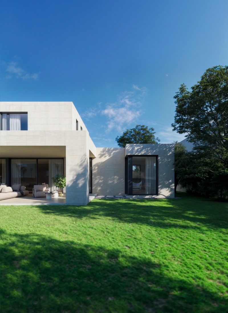 Für die Kunden waren offene und Außenbereiche von entscheidender Bedeutung, da sie ihr zukünftiges Haus als Ort der Begegnung und Geselligkeit mit Freunden und Familie konzipierten. Aus diesem Grund wurden ein offenes Wohnzimmer (mit separaten Bereichen) und dessen Fortsetzung nach außen mit großen Fensterfronten und der Veranda vorgeschlagen.