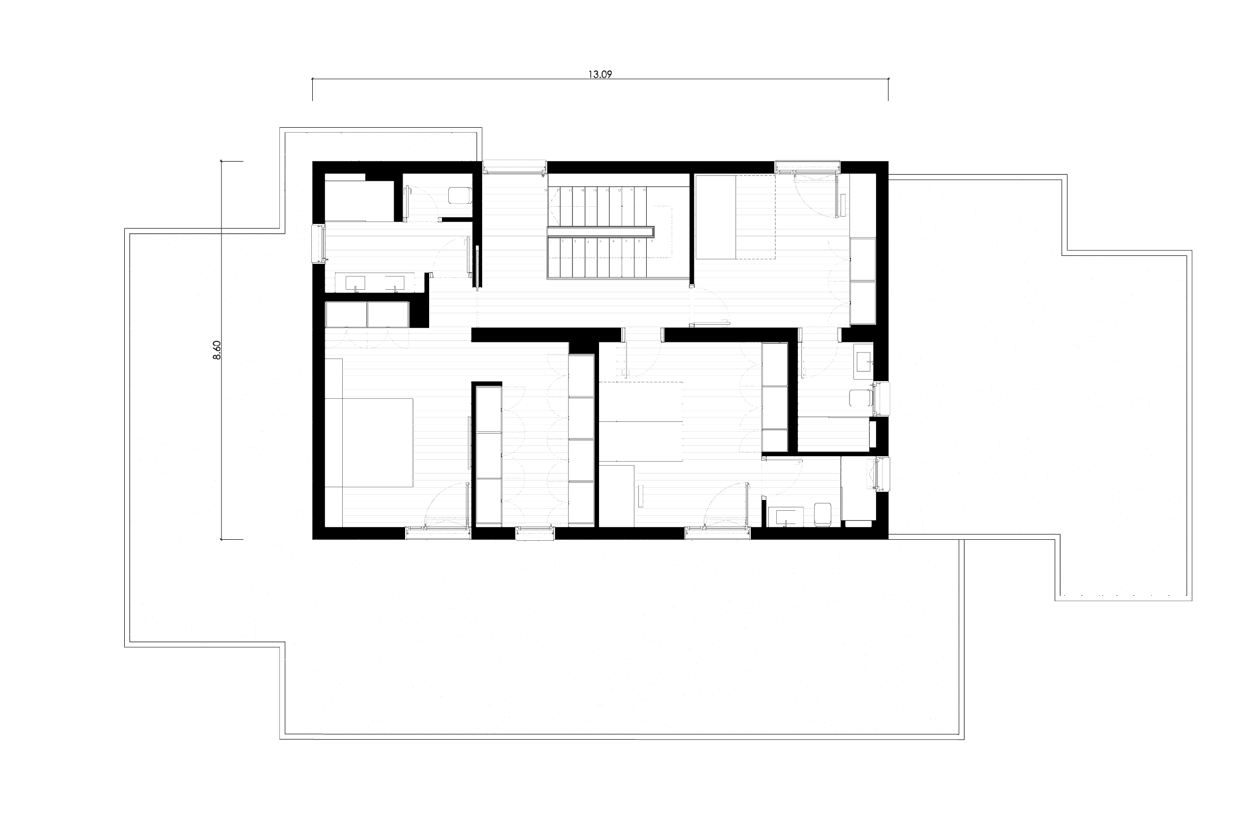 Im Obergeschoss befindet sich der Bereich für die Familienmitglieder mit drei Schlafzimmern mit eigenem Bad und separaten Badezimmern für jedes Zimmer.